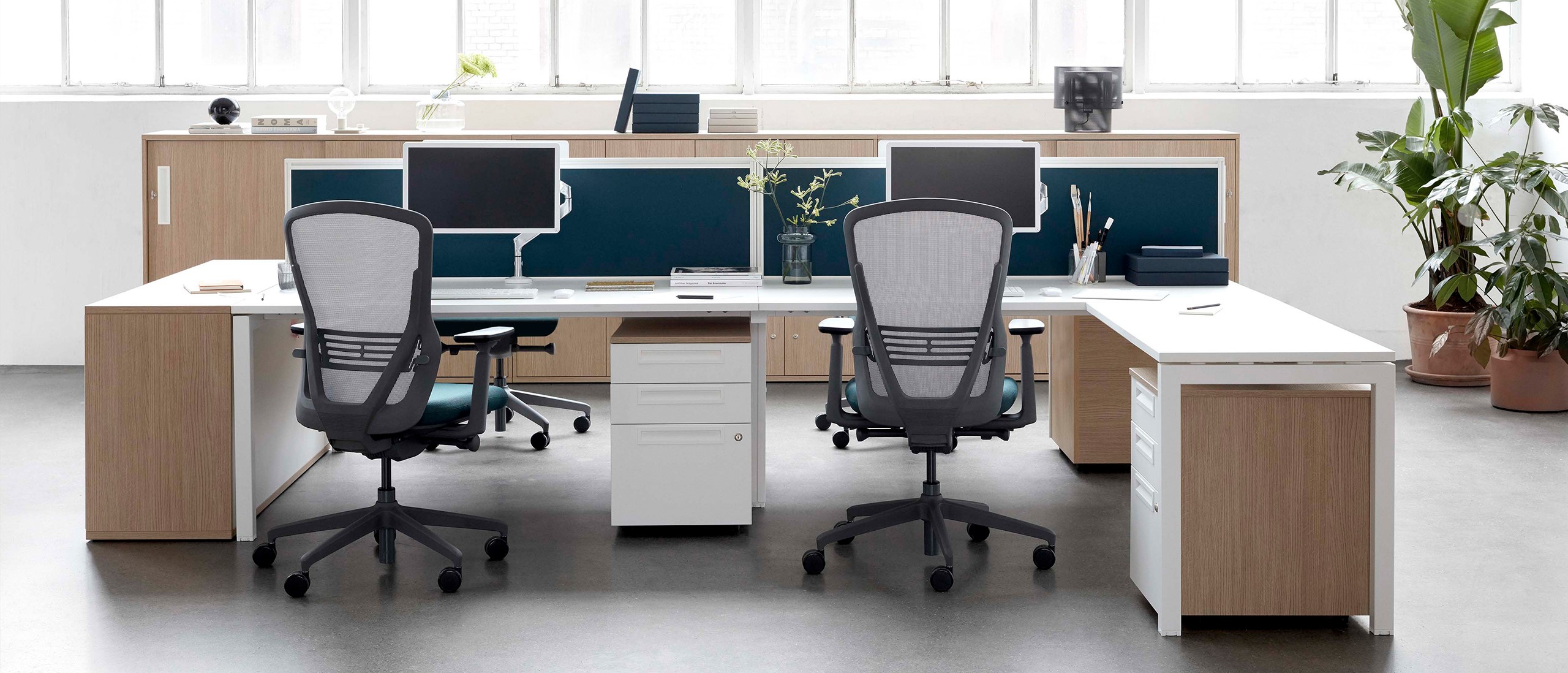The Chemistry range of workstations creates a stylish yet flexible solution that improves productivity and facilitates diversity for individuals and teams. Chemistry can be configured as individual desks or as a bench solution that shares components, allowing for the integration of partitions that form touch down workstations or meeting spaces.